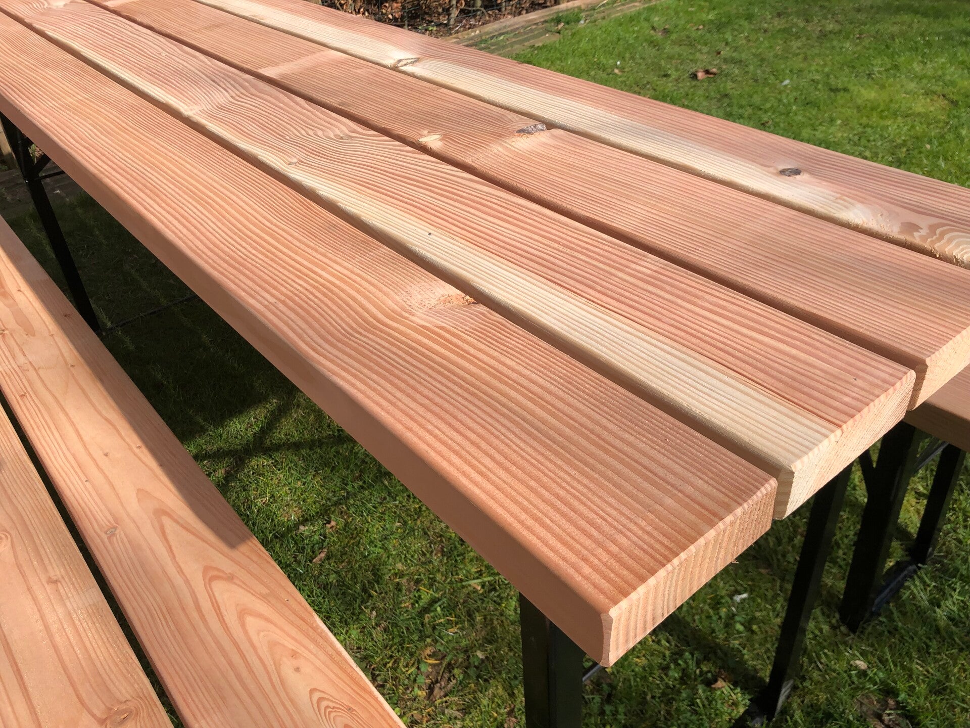 De tuinbank is gemaakt van massieve Douglas Lariks balken, ca. 4-4,5x14 cm en een stevig zwart gecoat stalen onderstel.